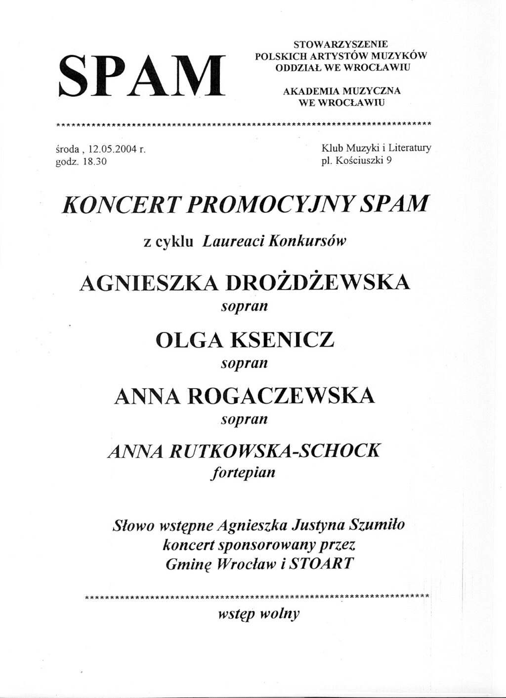 Anna Rogaczewska (sopran) - Koncert Promocyjny SPAM z cyklu Laureaci Konkursów (2004) - Klub Muzyki i Literatury - (Wrocław, Polska - str. 1)