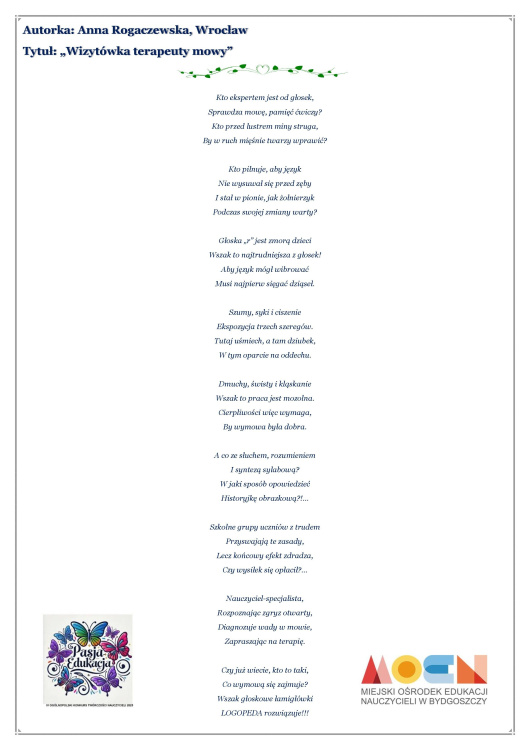 Wiersz - Wizytówka terapeuty mowy - Anna Rogaczewska (autorka) - IV Ogólnopolski Konkurs Twórczości Nauczycieli PasJA-Edukacja (2025) - Miejski Ośrodek Edukacji Nauczycieli (Bydgoszcz; Polska)